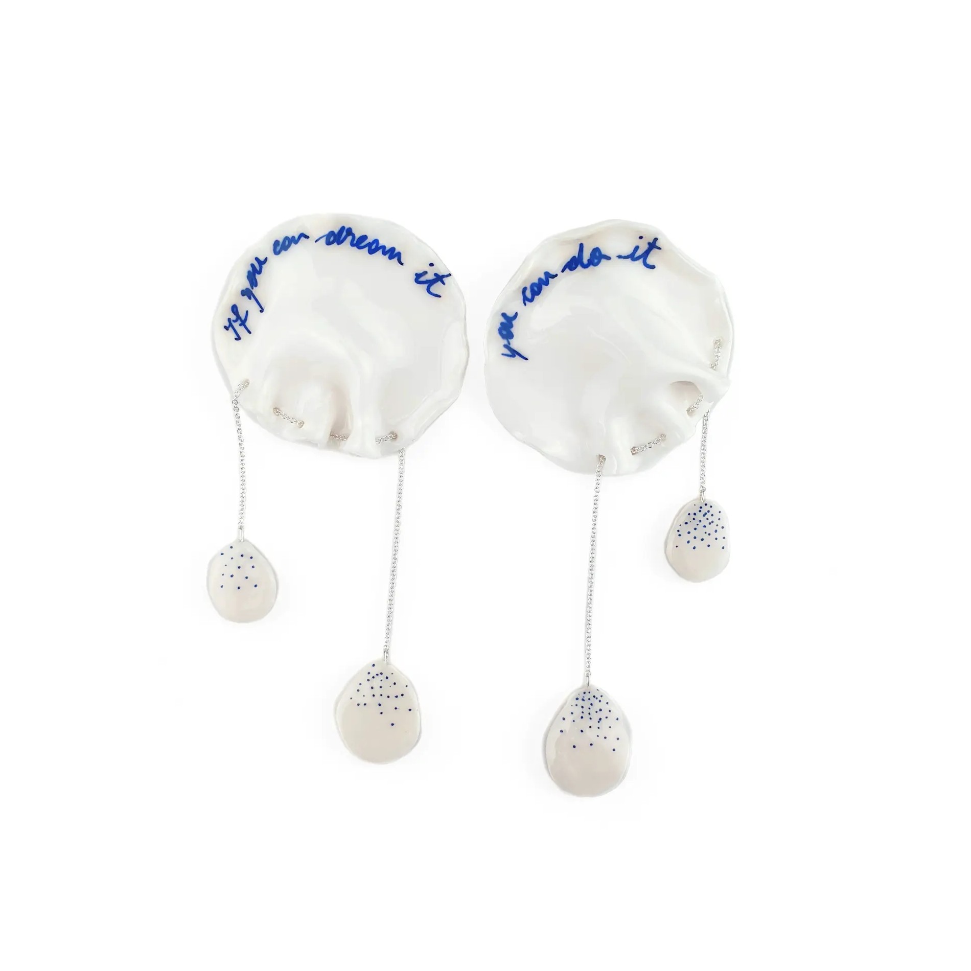 Statement earrings in glossy white resin with gold leaf and blue message.